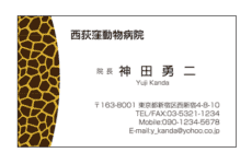 キリン模様入動物病院名刺-o0008 (o0008) キリンの模様を入れた動物病院用スタッフ名刺です。 【適用業種】動物病院、ペットショップ、動物園スタッフ ※獲得ポイント:商品代金の5%(会員限定) 30枚 … 続きを読む キリン模様入動物病院名刺-o0008